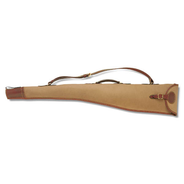 Constructed of our world famous canvas cotton twill, a layer of closed cell foam, lined with acrylic fleece and trimmed with rich chestnut leather to form a gun slip that is not only water resistant, but very functional in the field. All hardware is solid brass. The shoulder strap and handle are reinforced and hand stitched. The hand-crafted universal nose cone will accommodate side by side or over and under guns (please specify barrel length). Available for barrel lengths of 28", 30", 32".