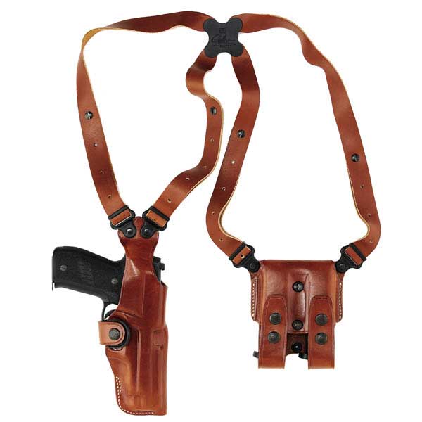 Galco combined features from our Miami Classic™ with a traditional vertical shoulder holster to create a system that’s perfect for the 21st century’s first responders and military personnel. Combat-proven in Iraq and Afghanistan, the VHS™ has been field tested over military uniforms and general hunting clothing with great success, and thousands are currently in use by American armed services personnel fighting the Global War on Terrorism. Although we did not set out to create another concealment rig, we discovered that it’s hard to break away from our roots. The VHS provides a long-awaited alternative for those who want the concealment of our Miami Classic but, for whatever reason, prefer the classic vertical carry style. A key component of this patented shoulder system is its spider harness. All four points of the spider harness can pivot independently and are connected by our clover shape, trademarked Flexalon™ swivel back plate. This, along with our patented swivel connectors, results in a perfect fit and lasting comfort for virtually all body sizes and shapes. The Vertical Shoulder Holster System consists of holster, harness, ammo carrier and a set of system screws. Fully modular, optional accessories and components may be purchased separately. Whether you patrol the perilous sands of the Middle East, walk the mean streets of metropolitan America, or stalk the hunting fields of the world, the VHS will help you and your handgun stay secure in an often-dangerous world. Made for semiautomatic pistols and double-action revolvers, the VHS is ambidextrous and available in tan or black finish.